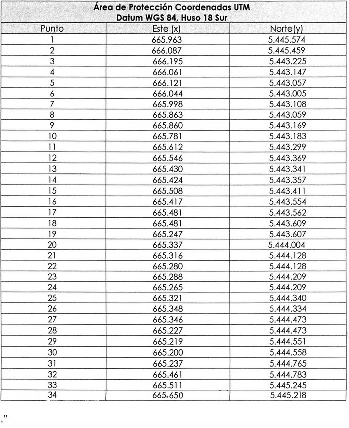 "El área protegida de la zona típica tiene una superficie de 960.148 mts2, como se grafica en el polígono 1-2-3-4-5-6-7-8-9-10-11-12-13-14-15-16-17-18-19-20-21-22-23-24-25-26-27-28-29- 30-31-32-33-34-1, del plano adjunto Nº 007-2017, visado por el Consejo de Monumentos Nacionales y que forma parte del presente decreto y cuyos límites son los siguientes: