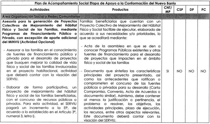 "5.1.2.- Plan de Acompañamiento Social Etapa de Apoyo a la Conformación del Nuevo Barrio. Los recursos dispuestos en este artículo para que Serviu desarrolle el Plan de Acompañamiento Social Etapa de Apoyo a la Conformación del Nuevo Barrio, estarán disponibles desde el momento de la recepción de obras por parte del Serviu. Bajo esta modalidad, los Serviu podrán ejecutar directamente el Acompañamiento Social en la Conformación del Nuevo Barrio o bien contratar para ello a personas naturales o jurídicas inscritas en el Registro de Consultores del Minvu, regulado por el DS N° 135 (V. y U.), de 1978, Título IV, Rubro Prestaciones de Asistencia Técnica.