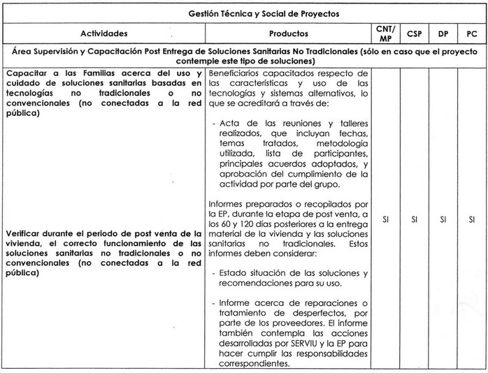 . h) En el numeral 2.5, Cuadro denominado "Gestión Técnica y Social de Proyectos", agregando una última Actividad denominada "Área Supervisión y Capacitación Post Entrega de Soluciones Sanitarias No Tradicionales":