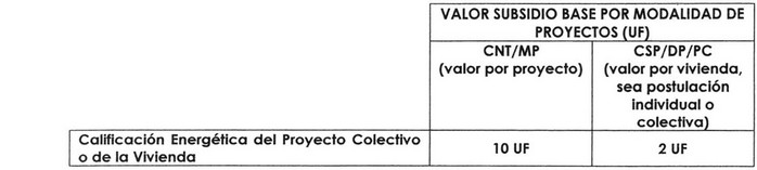 Respecto al proceso de Calificación Energética de Viviendas (precalificación y calificación), el Serviu pagará a la entidad calificadora, autorizada para desarrollar este servicio, los siguientes valores de subsidio base de asistencia técnica, sea cual fuere el número de viviendas que componen el proyecto colectivo, o bien se trate de vivienda individual, conforme al siguiente cuadro: