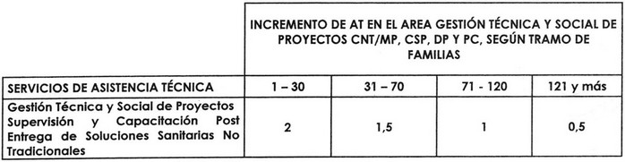 Tratándose de proyectos CNT/MP, CSP, DP o PC, cuando el Área Gestión Técnica y Social de Proyectos incluya la Supervisión y Capacitación Post Entrega de Soluciones Sanitarias No Tradicionales (Ej. Sistema de Tratamiento de Aguas Servidas), el valor de la asistencia técnica se incrementará conforme a lo establecido en el siguiente cuadro: