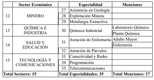 , agregándose los siguientes sectores económicos, especialidades y menciones: