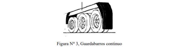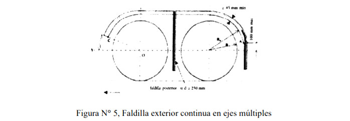 . c. En el caso de ejes múltiples, cuando la faldilla exterior pueda estar recta, los requisitosdel punto b anterior no se aplicarán entre los planos transversales verticales que pasan por el centro del primer y del último eje, a fin de dar continuidad al sistema anti proyección (Figura N° 5).