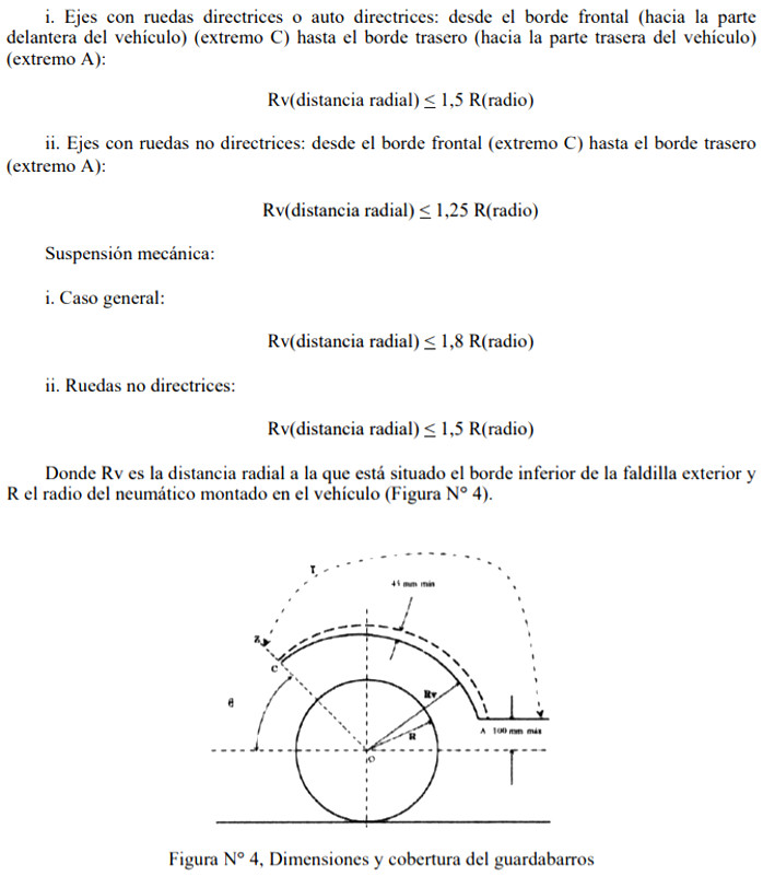 b. En el caso de ejes únicos, el borde inferior de la faldilla exterior no podrá estar situado más allá de las siguientes distancias y radios, medidos a partir del centro de la rueda, salvo en los extremos inferiores, que podrán redondearse (Figura N° 4).