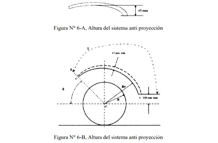 . d. La distancia entre los puntos más alto y más bajo del sistema anti proyección (guardabarros y faldilla exterior) medida en cualquier corte transversal perpendicular al guardabarros no deberá ser inferior a 45 mm en todos los puntos situados tras una línea vertical que pase por el centro de la rueda o, en caso de ejes múltiples, por el centro de la primera rueda (Figura N° 6-A). Esta dimensión puede irse reduciendo gradualmente por delante de esta línea (Figura N° 6-B).