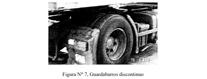 . f. No deberá existir ninguna abertura entre el borde inferior posterior del guardabarros y la faldilla posterior que permita la salida de elementos proyectados cuando el vehículo está en movimiento.