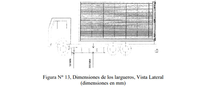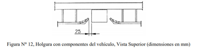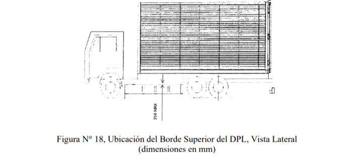 a. El borde superior del DPL no se encontrará a más de 350 mm por debajo de la parte inferior de la base de la estructura del vehículo, medida en un plano vertical tangente a la superficie externa de los neumáticos (Figura N° 18), excluidos los abultamientos próximos al suelo, excepto en los siguientes casos: