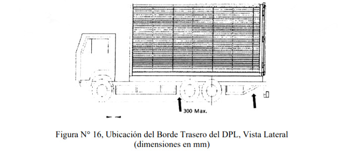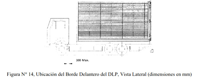 a. La posición del borde delantero del DLP debe estar a una distancia no mayor a 300 mm por detrás del plano vertical perpendicular al plano longitudinal del vehículo y tangencial a la parte exterior del neumático de la rueda inmediatamente anterior al DPL (Figura N° 14).