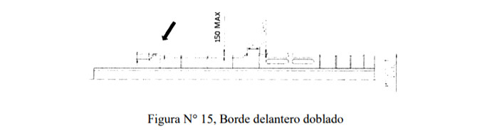 Cuando los 300 mm a que se refiere el punto a. anterior, caigan en el interior de la cabina, el DPL deberá estar construido de manera que la distancia entre su borde anterior y las paredes de la cabina no sobrepase los 100 mm y, si es necesario, estará doblado en un ángulo que no exceda de 45°. En este caso, no será necesario que el borde delantero conste de un elemento vertical (Figura N° 15).