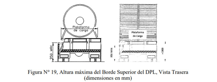 i. Cuando el plano descrito en el punto 5.a., no corte la estructura del vehículo, el borde superior estará a nivel con la superficie de la plataforma de carga, o a 950 mm del suelo; se optará por la distancia menor (Figura N° 19).