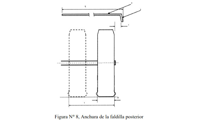 a. La anchura de la faldilla deberá cumplir los requisitos fijados para «q» en el punto 2.a.iii, excepto para la parte de la faldilla que esté contenida dentro del guardabarros, en cuyo caso deberá ser al menos de igual anchura que la banda de rodadura del neumático (Figura N° 8).