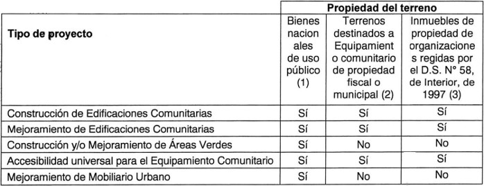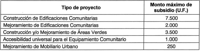a) Proyectos para el Equipamiento Comunitario: Se podrá postular de manera simultánea a proyectos de Mejoramiento de Edificaciones Comunitarias, Construcción y/o Mejoramiento de Áreas Verdes y/o Mejoramiento de Mobiliario Urbano, siempre que la suma total del subsidio solicitado no supere las 5.000 UF.