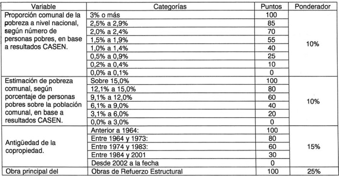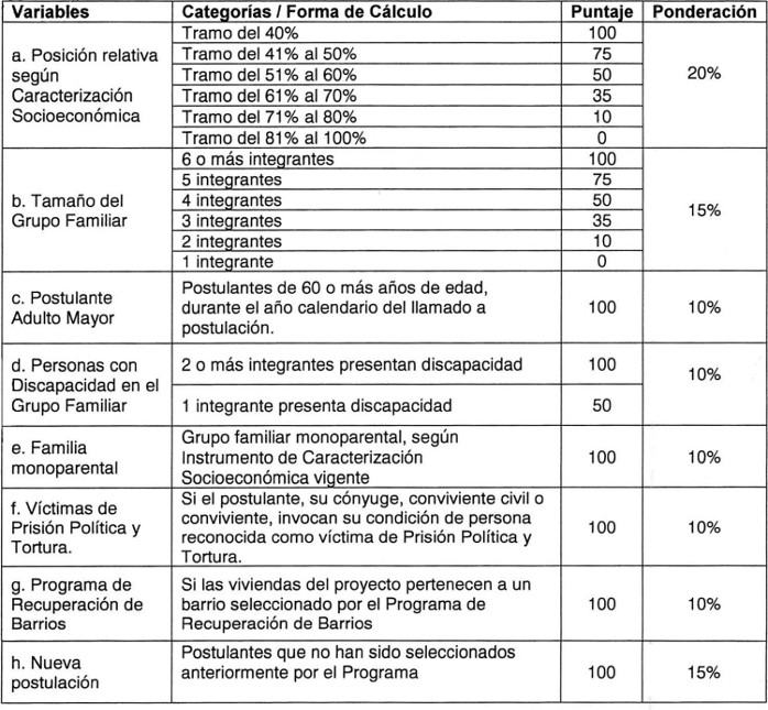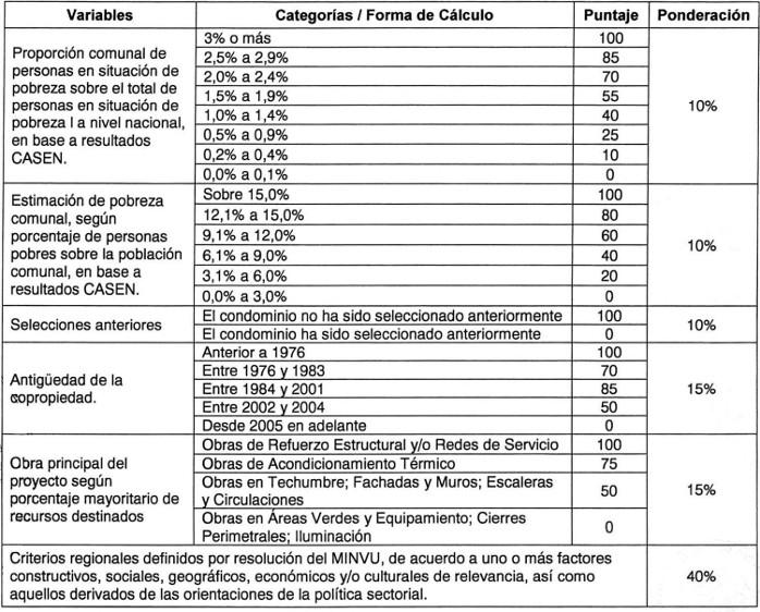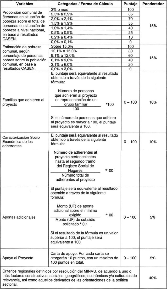 Artículo 101. Las variables, categorías y fórmulas para asignar un puntaje a las postulaciones que regula este Capítulo, serán las siguientes: