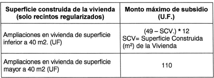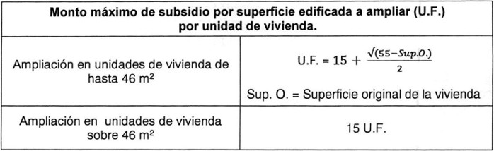 . En proyectos de Ampliación, el monto máximo del subsidio por cada unidad de vivienda a intervenir, será el expresado en el siguiente cuadro, dependiendo de la superficie edificada de las unidades de vivienda: