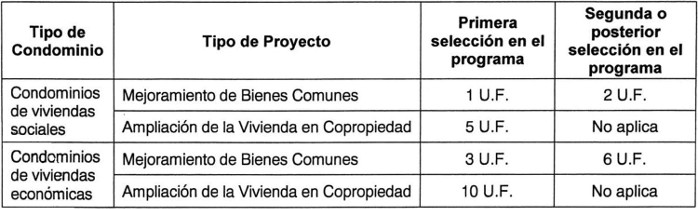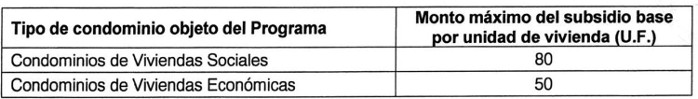 Artículo 84. Para los Proyectos de Mejoramiento de Bienes Comunes, el monto máximo del subsidio base a otorgar por cada unidad de vivienda considerada en el proyecto, será el señalado en la siguiente tabla, según corresponda al tipo de condominio objeto del programa que postula: