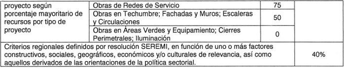 . De los subsidios que se indican en el cuadro precedente, podrá destinarse hasta un monto máximo del 20% para la ejecución de partidas que no correspondan al tipo de proyecto presentado, pero que se trate de obras complementarias e indispensables a aquellas asociadas a la ejecución del subsidio, tales como pinturas, cambio de planchas de cubierta y planchas de cielo, entre otras.