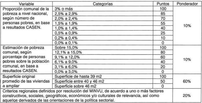 En el caso de postulaciones a Proyectos de Ampliación de la Vivienda y Adecuación de Viviendas, el puntaje total obtenido a partir de los factores de aplicación general descritos en el numeral 1 de este Artículo, se complementarán con los señalados a continuación, representando estos últimos el 40% del puntaje definitivo:
