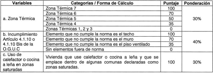 2. Factores aplicables a los Proyectos de Acondicionamiento Térmico de la Vivienda: En el caso de postulaciones a Proyectos de Acondicionamiento Térmico de la Vivienda, el puntaje obtenido a partir de los factores de aplicación general descritos en el numeral anterior, se complementará con los que se señalan a continuación, representando estos últimos el 60% del puntaje definitivo: