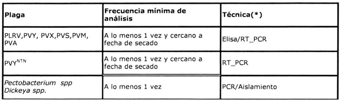 Para verificar la ausencia de las plagas descritas en el cuadro 1, se exigirán los análisis fitopatológicos con la frecuencia y técnicas que se señalan a continuación: