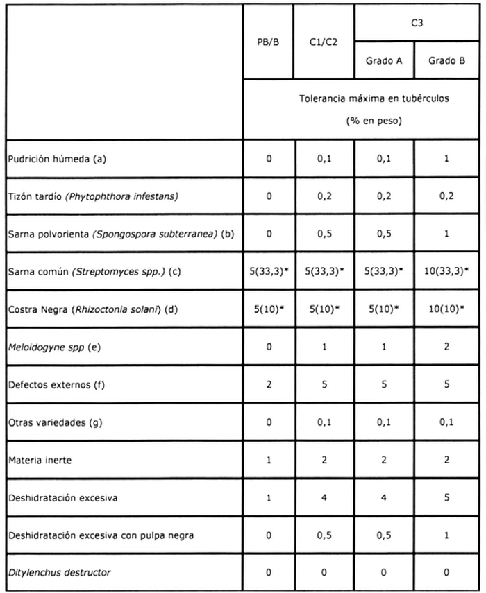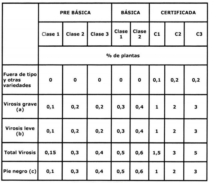 c) Pie negro (Pectobacterium spp.): los porcentajes indicados deberán cumplirse.
