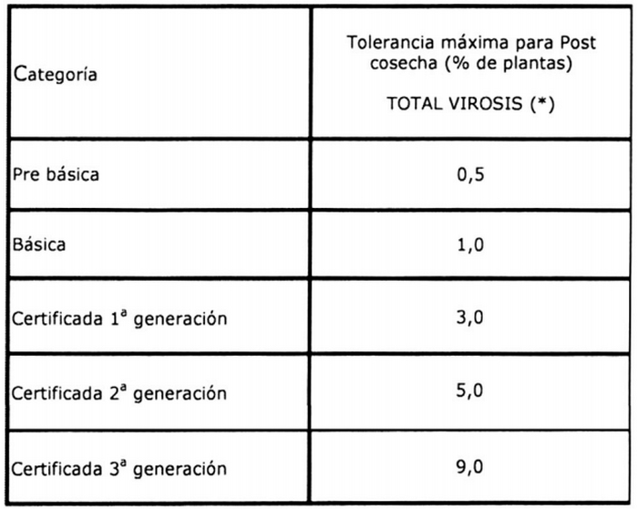 El resultado de las pruebas de post cosecha determinará en última instancia, la clasificación de la producción de un semillero en la categoría o generación que corresponda, según las siguientes tolerancias máximas descritas en el Cuadro 4.