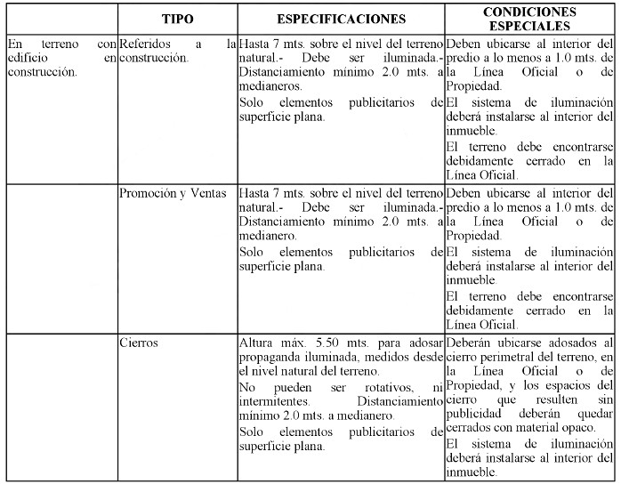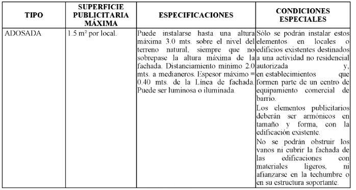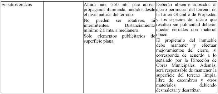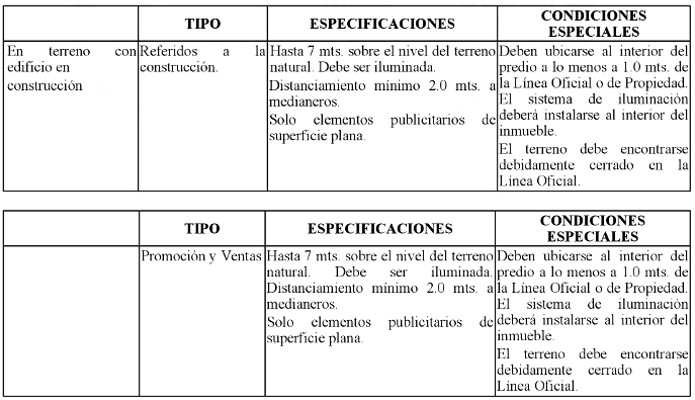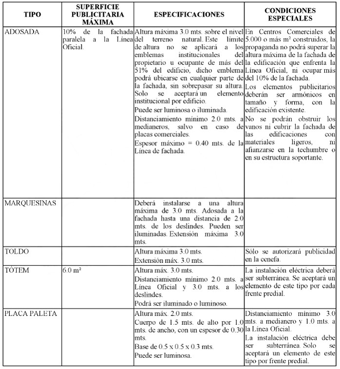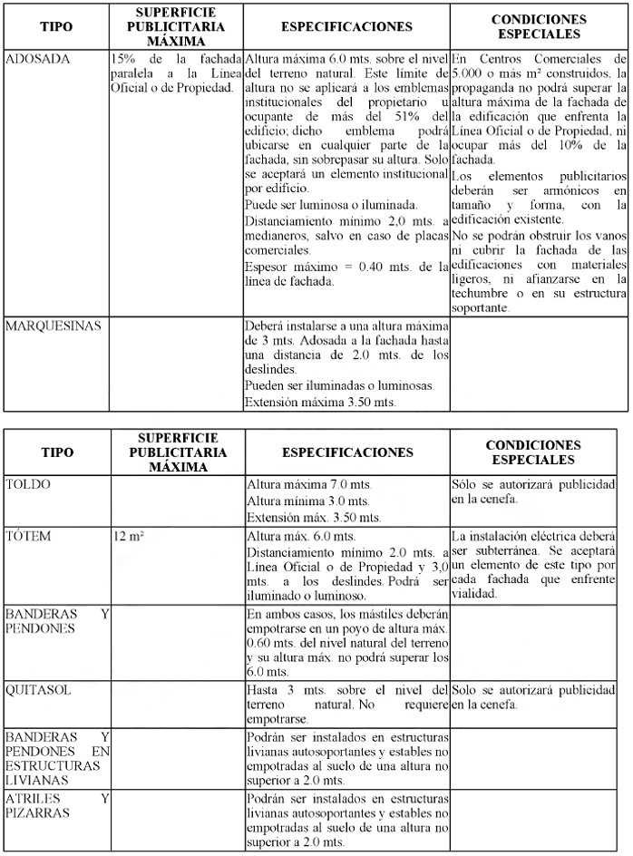 Los elementos publicitarios no contemplados en dichas tablas para cada zona, se encuentran prohibidos.