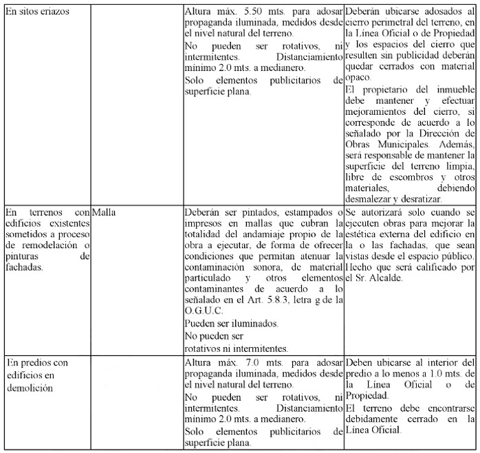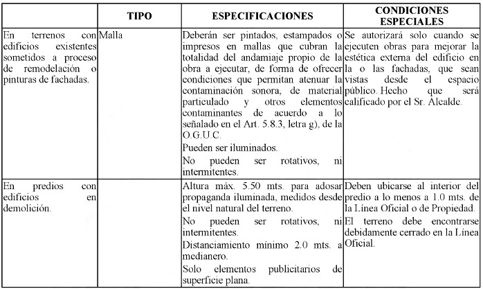 La superficie, especificaciones, condiciones especiales y tipo de los elementos publicitarios, serán los que se indican en las tablas del presente artículo, conforme a los sectores en que se emplazan, definidos en la presente ordenanza.