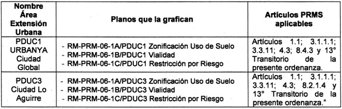 Corresponden a las Áreas de Extensión Urbana que surgen de la puesta en vigencia de las modificaciones al Plan Regulador Metropolitano de Santiago (PRMS), a raíz de los Proyectos con Desarrollo Urbano Condicionado (PDUC), aprobados de acuerdo a lo establecido en el artículo 8.3.2.4 de la presente ordenanza y que se encuentran graficadas en los planos que en cada caso se indica a continuación.