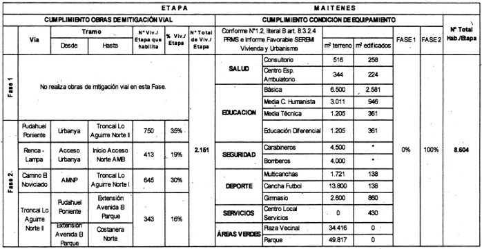 * En el caso particular de calle Los Maitenes, si la vía existente no está entregada al uso público al momento de la recepción municipal de las primeras viviendas de la Fase I, entonces los titulares de los PDUC deberán realizar las gestiones y concurrirán al financiamiento para lograr que sea entregada al uso público con una capacidad de 2 pistas/sentido en el tramo Costanera Norte-calle servicio Vespucio Express. Si Los Maitenes está entregada al uso público, entonces se hará uso de ella y los titulares de los PDUC implementarán las medidas de gestión de tránsito necesarias pare su buen funcionamiento.