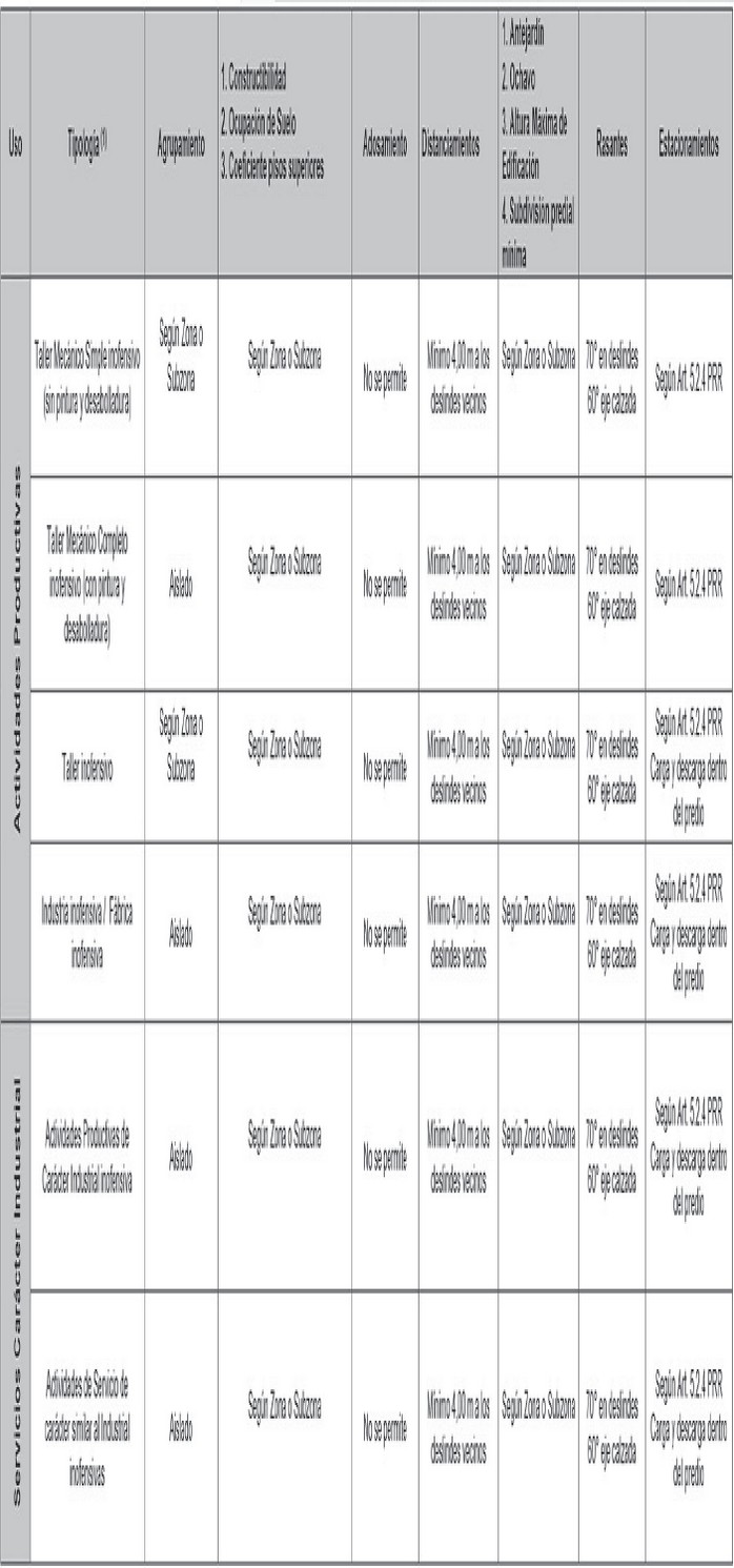 - Industria, Actividades Productivas de Carácter Industrial, Servicios de Carácter Industrial. Las que deberán cumplir con las condiciones detalladas en el Cuadro N°2 A de esta Ordenanza.