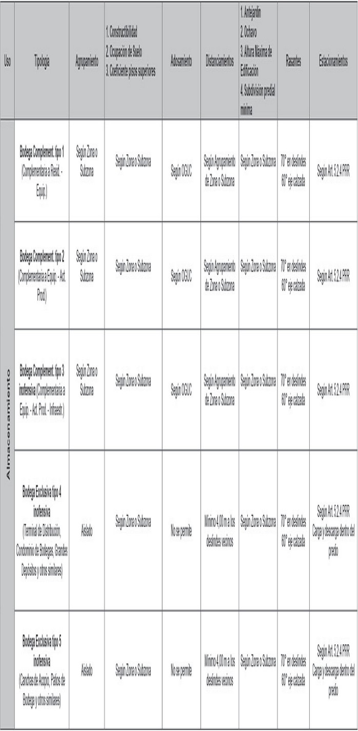 - Almacenamiento: Bodega, la que debe cumplir con las disposiciones contempladas en el Cuadro N° 2B de la presente Ordenanza.