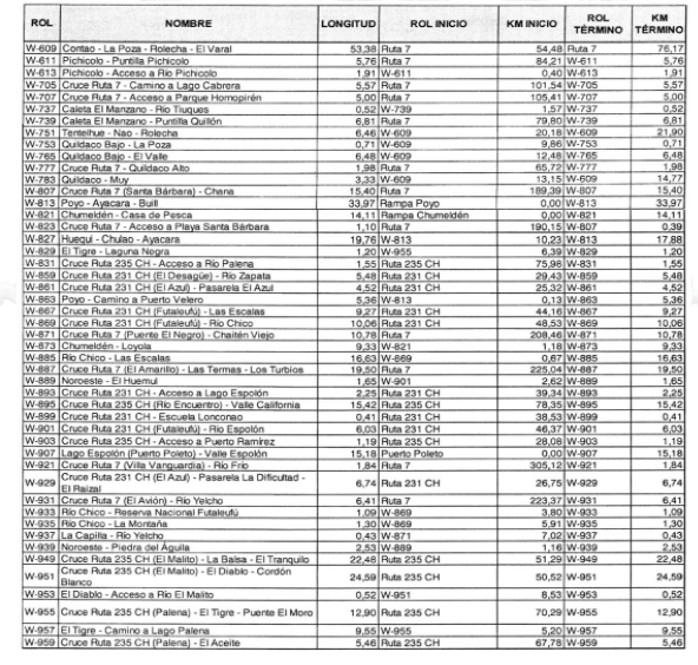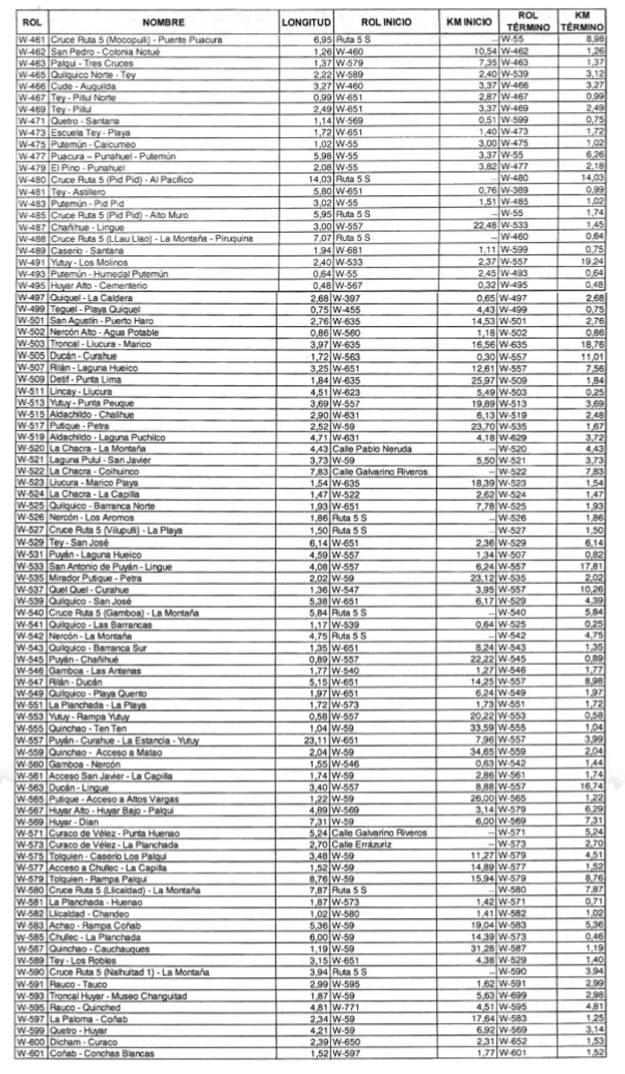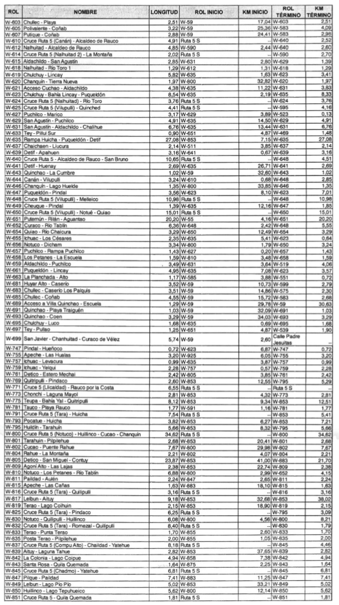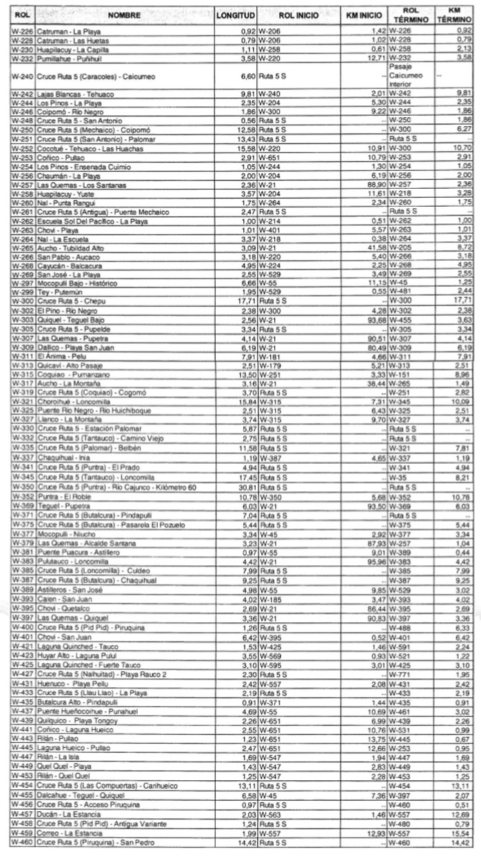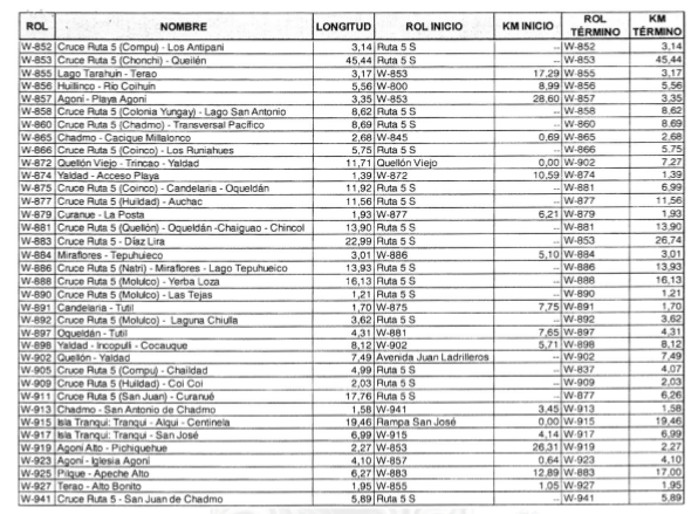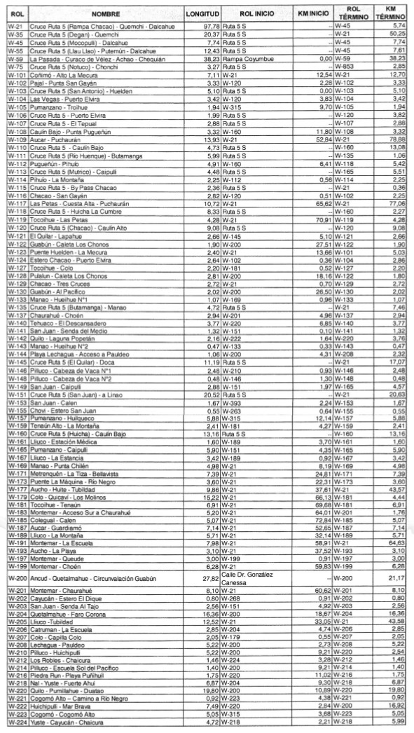 - Resolución DV (exenta) Nº 2.136, de 2000, que ratifica roles de caminos públicos, en lo que respecta a los caminos de las provincias de Chiloé y Palena de la X Región de Los Lagos.