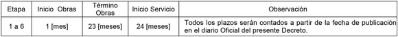 2. Los plazos máximos para el inicio y término de la construcción de las obras, así como para el inicio del servicio, de cada etapa, serán los que se indican a continuación:
