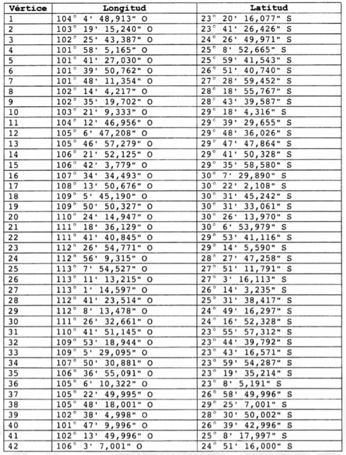 Artículo 2°. Límites. Los límites del Área Marina Costera Protegida de Múltiples Usos, representados en el mapa adjunto, y del cual se excluyen las concesiones marítimas vigentes, se detallan en coordenadas geográficas WGS 84, y son las siguientes: