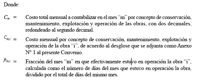 2.7 Por concepto de costos de conservación, mantenimiento, explotación y operación de las "Obras Adicionales CAR N° 1", se fija la cantidad mensual máxima de UF 3.912,60 (tres mil novecientas doce coma sesenta Unidades de Fomento), neta de IVA. El valor máximo que se reconocerá por este concepto, para cada una de las obras, es el indicado en el desglose que se adjunta comoAnexo N° 1 al presente Convenio, y su monto definitivo será calculado considerando para ello las proporcionalidades correspondientes, de acuerdo a la fracción del mes en que estén efectivamente operativas las obras.