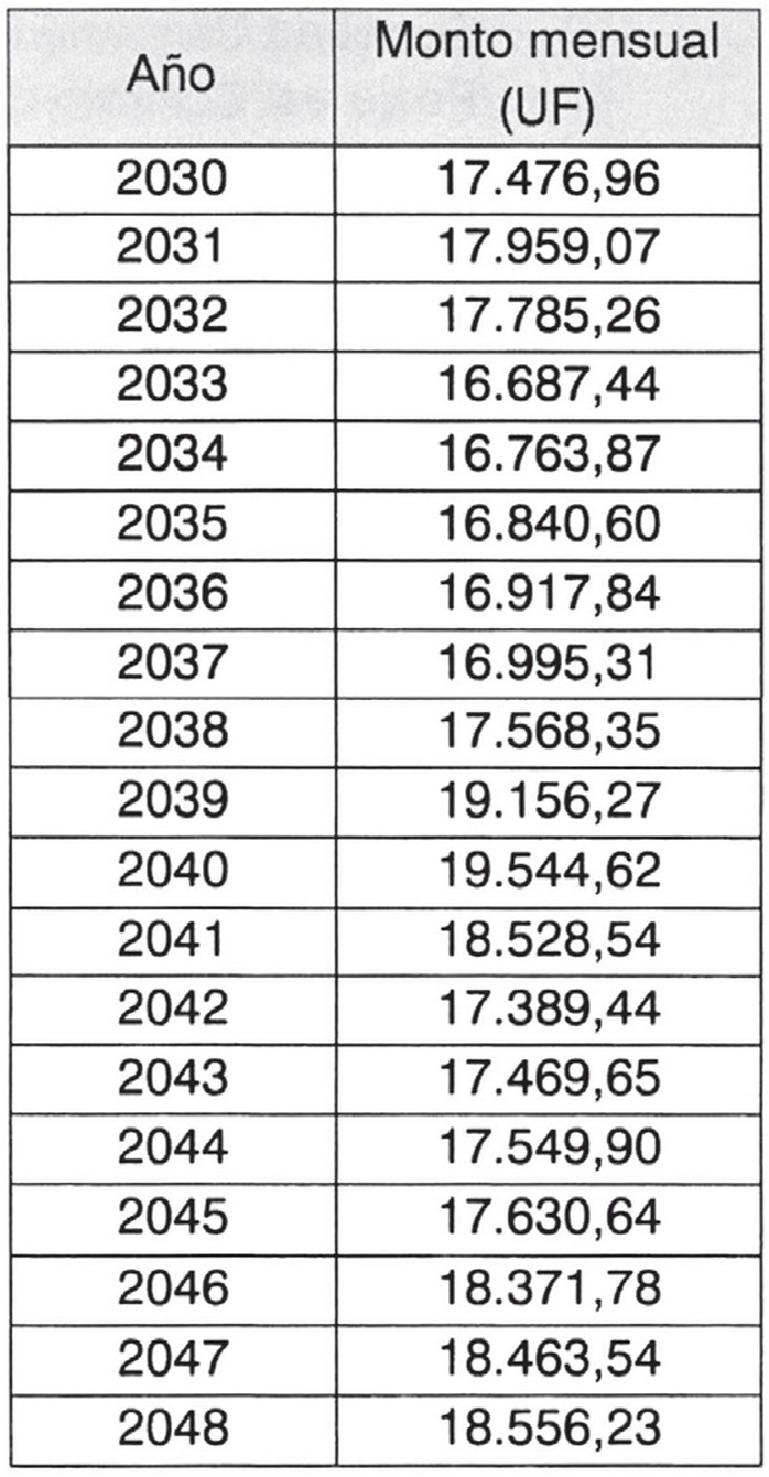 Se deja constancia que el monto mensual antesseñalado incluye el descuento equivalente a UF 816,97 (ochocientas dieciséis coma noventa y siete Unidades de Fomento) anuales, por la eliminación de laobligación de la Sociedad Concesionaria de ejecutar la pasarela peatonal San Jorge, Dm. 62.795, a la que se hace referencia en el artículo 2.3.1.11 de las Bases de Licitación, lo cual se regulará en el decreto supremo que apruebe el presente Convenio, de conformidad a la modificación señalada en el literal b) del numeral 1.7 precedente.