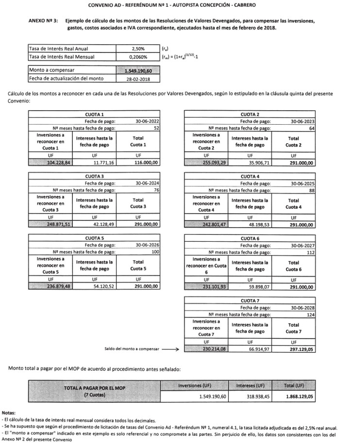 - El ConvenioAd-Referéndum N° 1 de fecha 22 de diciembre de 2017, del contrato de concesión de la obra pública fiscal denominada "Concesión Autopista Concepción - Cabrero".