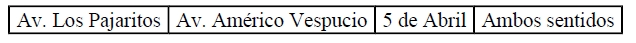1. Modifícase la tabla contenida en el resuelvo Nº 1, de la resolución exenta Nº 462, de 23 de febrero de 2007, de la Secretaría Regional Ministerial de Transportes y Telecomunicaciones de la Región Metropolitana, en el sentido de reemplazar la fila correspondiente a Av. Los Pajaritos, por la siguiente: