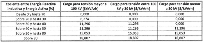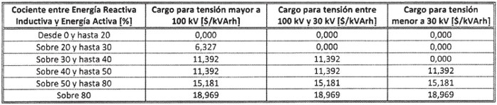 . La aplicación de los cargos presentados en los cuadros 5.1.1 y 5.1.2, se deberá realizar considerando el desglose del cociente entre la energía reactiva inductiva y energía activa, para cada uno de los tramos indicados. Así, en caso de que dicho cociente exceda el rango exento de pago, comprendido entre 0% y 20%, sólo se deberá aplicar el cargo al exceso por sobre el 20%. Dicho exceso deberá dividirse en cada uno de los rangos indicados en los cuadros 5.1.1 y 5.1.2, pagando el valor del rango respectivo, hasta alcanzar el valor total del cociente.