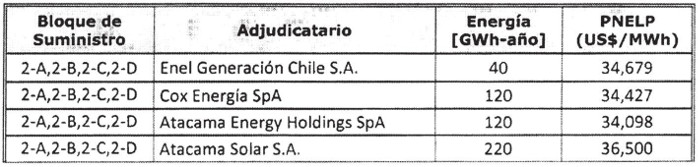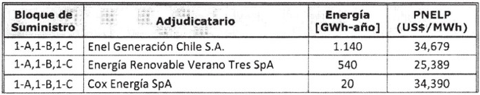 A continuación se detallan los precios de energía de largo plazo (PNELP) obtenidos en la licitación de suministro 2017/01, adjudicada con fecha 3 de noviembre de 2017.