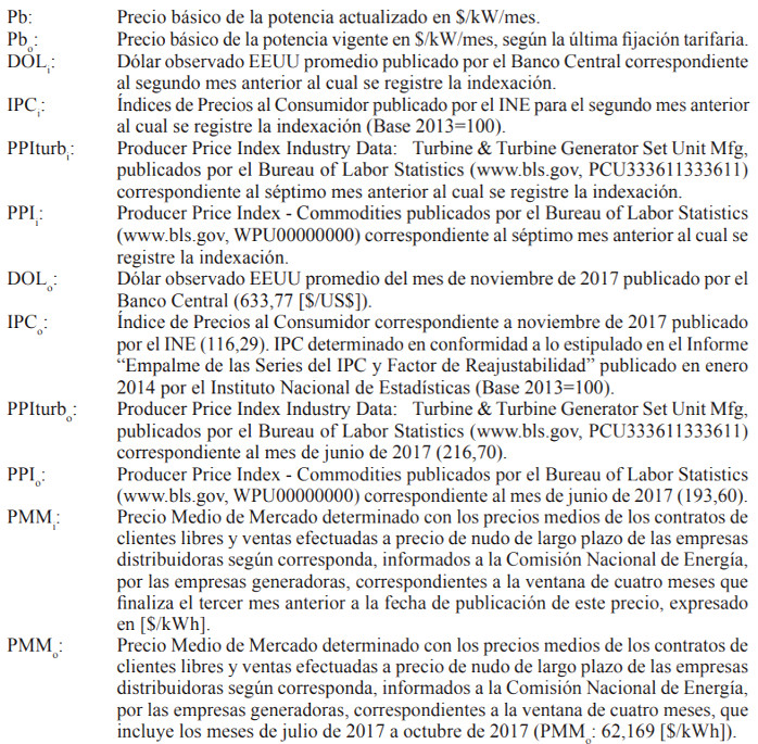 Los valores base aplicables a las fórmulas de indexación del precio de nudo de energía de largo plazo y del precio de nudo de potencia de largo plazo son los siguientes: