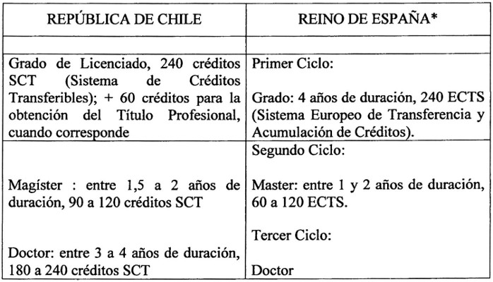 2. En el Reino de España, los títulos profesionales y grados académicos de licenciatura, magíster y doctorado, todos ellos obtenidos en universidades chilenas con reconocimiento oficial del Ministerio de Educación de la República de Chile.