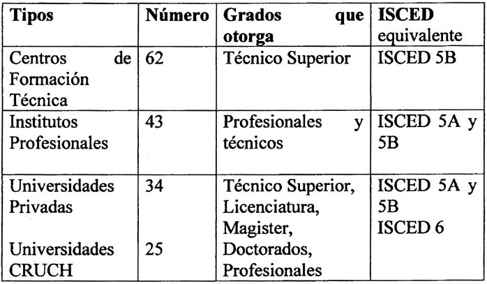 Las instituciones de educación terciaria pertenecen a tres categorías: Centros de Formación Técnica (CFTs), Institutos Profesionales (IPs) y Universidades. La duración de los cursos depende del tipo de institución.