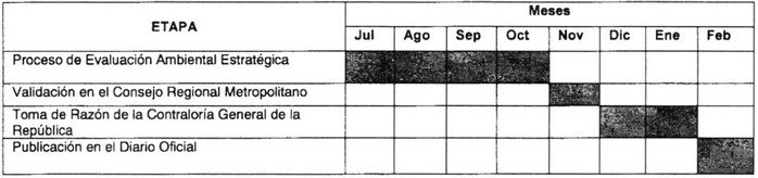 13. Que el cronograma estimativo de la modificación del Plan Regulador Metropolitano de Santiago, MPRMS-117 La Platina es el siguiente: