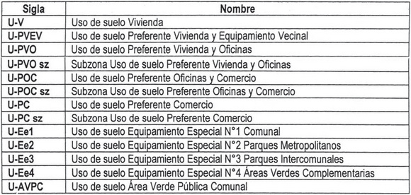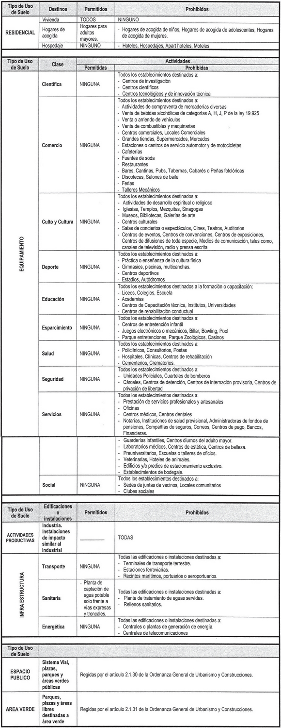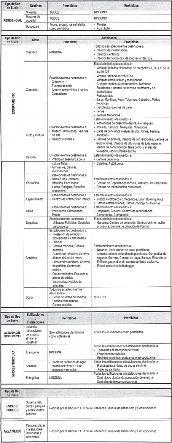 Los Tipos de Usos de Suelo que se permiten o prohíben son los señalados en los siguientes Cuadros referentes a cada una de las zonas y subzonas de Uso de Suelo establecidos para la Comuna de Vitacura: