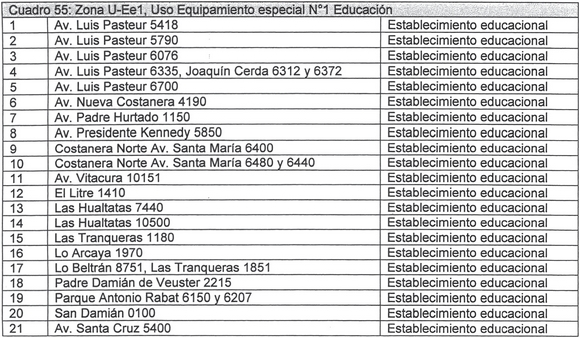1.2.8.1 En el Cuadro 55: Zona U-eE1, Uso Equipamiento Especial Nº 1, Educación, reemplazar el Cuadro existente por el siguiente: