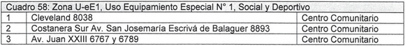 1.2.8.3 En el Cuadro 58: Zona U-eE1, Uso Equipamiento Especial Nº 1, Social y Deportivo, agregar los renglones 2 y 3, quedando como sigue: