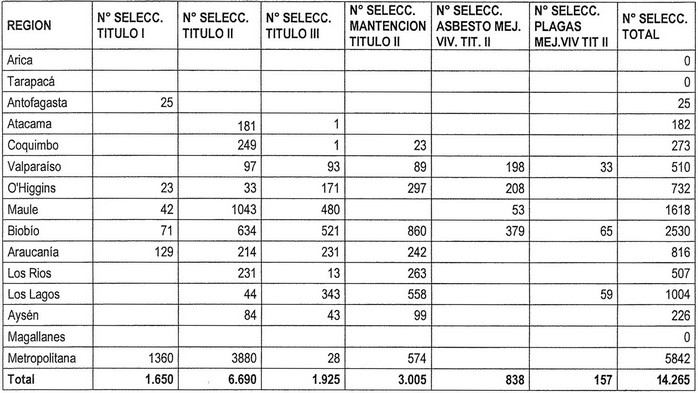 2. Apruébanse las nóminas de seleccionados para el otorgamiento de subsidios habitacionales correspondientes al primer proceso de selección del Llamado a Postulación Nacional en Condiciones Especiales año 2018, para el desarrollo de proyectos del Programa de Protección del Patrimonio Familiar en sus clases reguladas por los Títulos I, II y III, especialmente para proyectos que consideren Ampliaciones para Adultos Mayores, Mejoramiento de Viviendas de Personas con Discapacidad, Cambio de Techumbre con Asbesto, entre otros, efectuado mediante la resolución exenta N° 1.253 (V. y U.), de 2018, realizado en el mes de mayo de este año. Estas nóminas se adjuntan y se entenderán formar parte integrante de esta resolución. Además, fíjase el número de postulantes seleccionados por región, según se indica en la siguiente tabla: