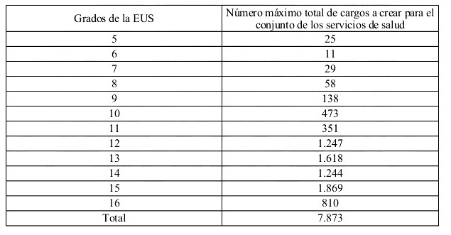 1. Modificar la planta de profesionales de los servicios de salud, establecidos en el artículo 16 del decreto con fuerza de ley N° 1, de 2005, del Ministerio de Salud, creando un total de 7.873 cargos adicionales para el conjunto de dichos servicios, de acuerdo con la siguiente distribución total por grados de la Escala Única de Sueldos: