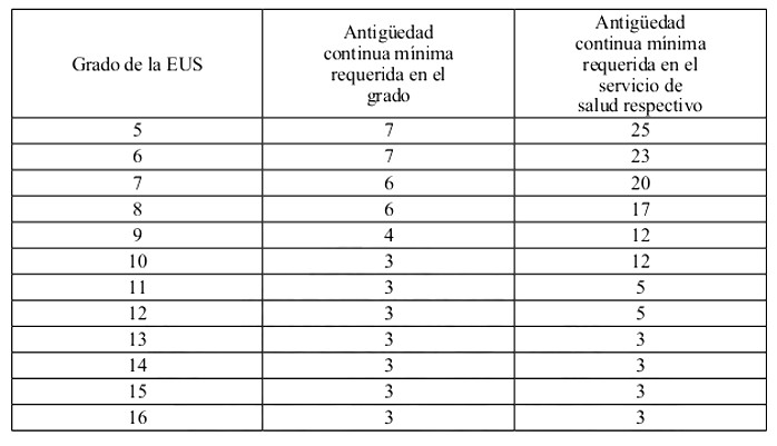 1. En los concursos internos sólo podrán participar los funcionarios a contrata asimilados a la planta de profesionales del respectivo servicio de salud, que se encuentren en el mismo grado de la vacante convocada, y que reúnan los requisitos de antigüedad, tanto en dicho grado como dentro del servicio de salud respectivo. Ambas antigüedades deberán verificarse a la fecha de publicación del respectivo decreto con fuerza de ley a que se refiere el artículo anterior, según la tabla siguiente: